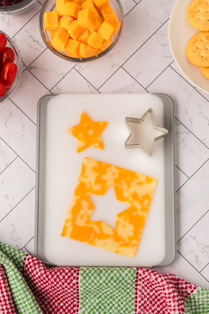 - First, make your tree topper. Use a star shaped cookie cutter to cut a star shape out of the slice of Colby jack cheese. Place the star at the top of a wooden cutting board.